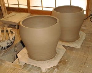 壺類を下半分、上半分に分けて作るのです。壺を上下に二分すると、お椀のようなものが二つになります。下の写真を見てください。